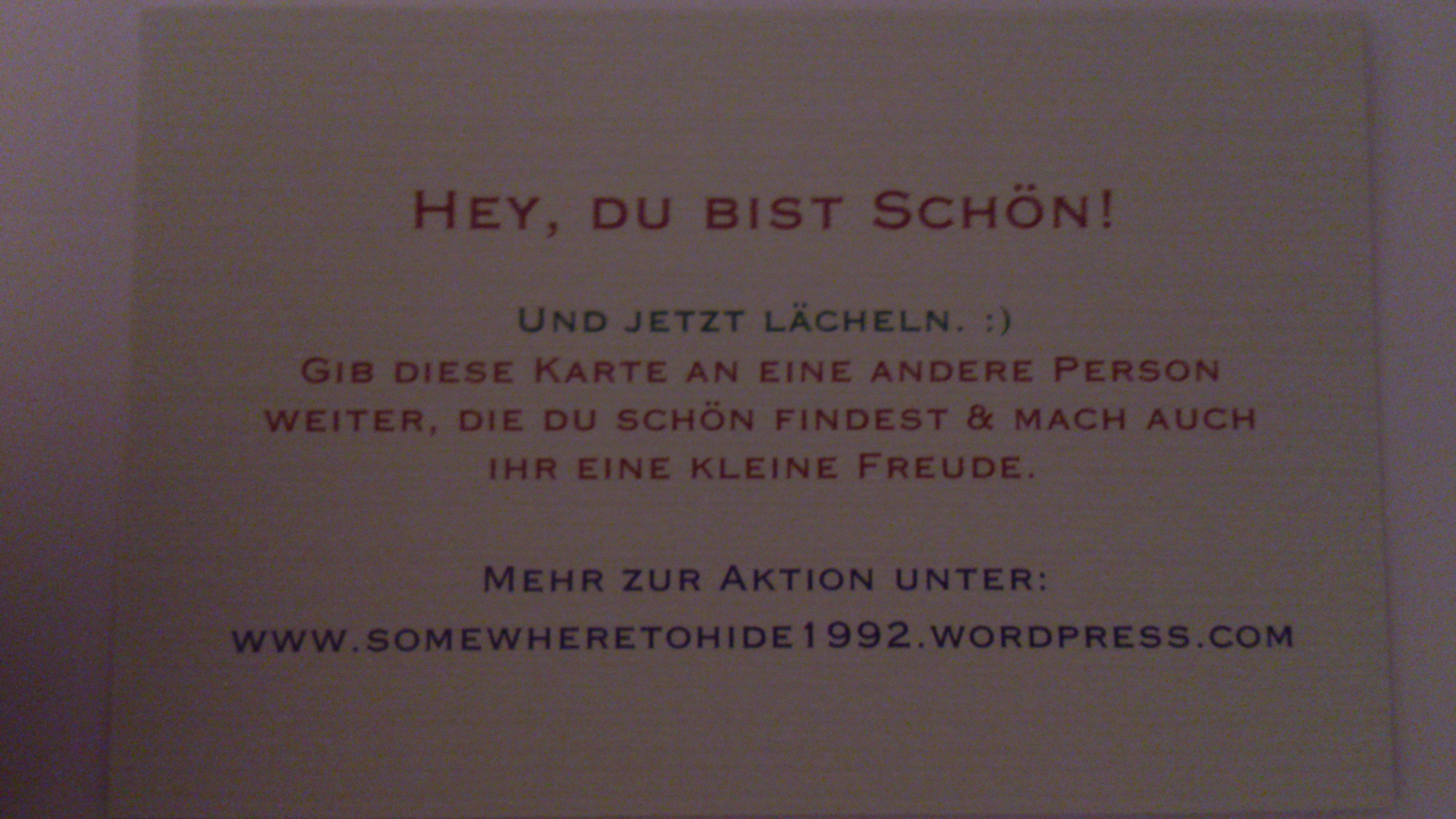 dieser Beitrag widmet sich meiner „Du bist schön“-Visitenkartenaktion. Ich werde in den nächsten Tagen beginnen die Karten zu verteilen, hier vorab ein Foto: