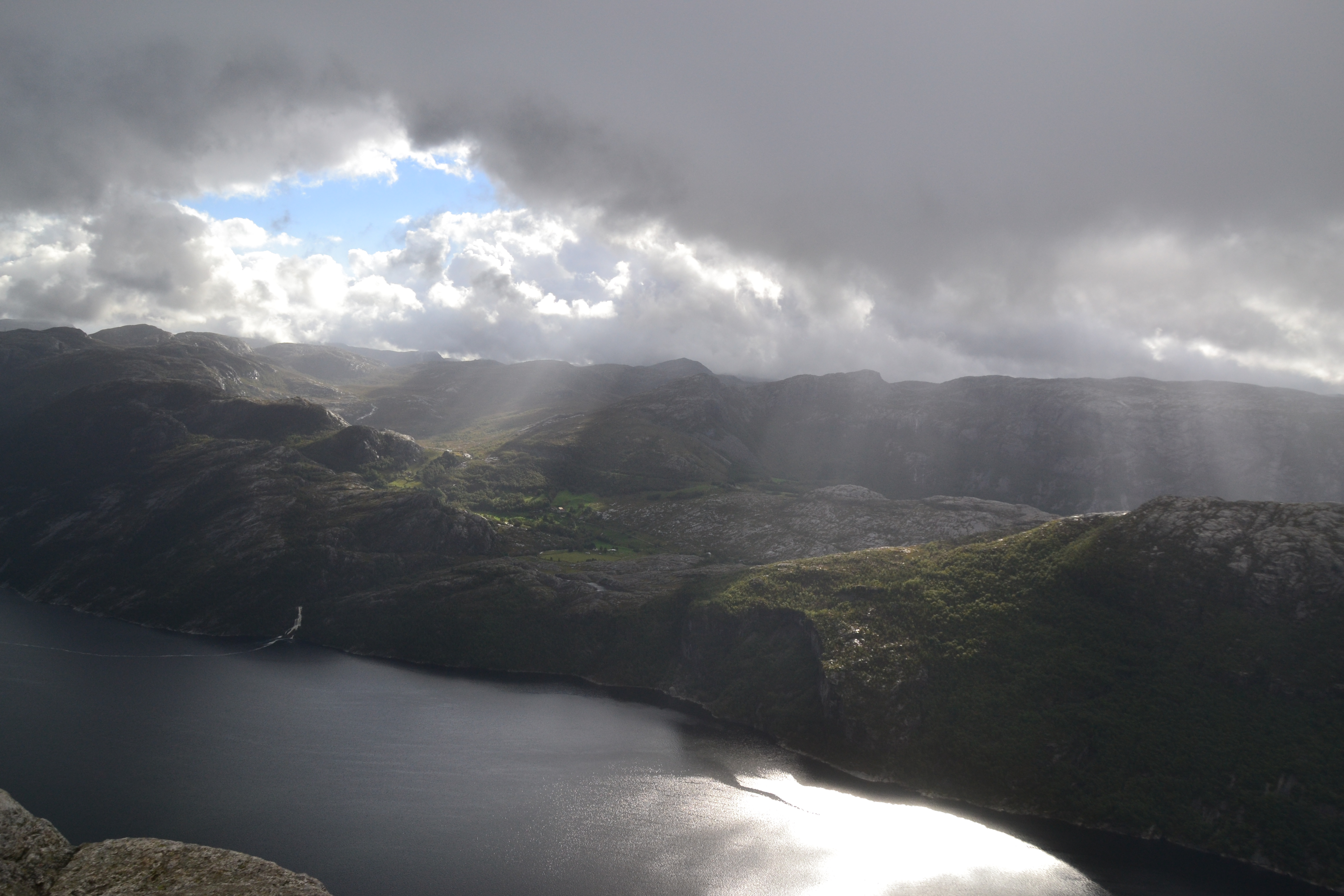 Nach ein paar verregneten Stunden in der Stadt und dazu kommenden Problemen mit der Kreditkarte (die sich im Nachhinein zum Glück wieder erledigt hatten) ging es in Richtung Preikestolen, wo für den kommenden Tag die dazugehörige Wanderung eingeplant war. Hier war das Wetter mittlerweile zwar etwas besser, jedoch immer noch nicht wirklich gut. Die Wanderung selbst lief wie erwartet, ich kannte das ja schon. Oben angekommen hingen die Wolken ziemlich tief, jedoch schafften es zumindest das ein oder andere Mal ein paar Sonnenstrahlen hindurch: