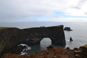 Fast in Sichtweite befindet sich Dyrhólaey, die „Türlochinsel“. Der Weg war dennoch deutlich mühsamer als zunächst vermutet. Die Straße nach oben war von riesigen Schlaglöchern und tiefen Pfützen übersät und die entgegenkommenden Fahrzeuge machten die Sache auch nicht einfacher. Mit ca. 10 km/h Durchschnittsgeschwindigkeit erreichten wir dennoch wohlbehalten (auch unser Mietwagen) den oben gelegenen Parkplatz. Hier befindet sich ein Leuchtturm und man hat einen super Überblick über die vom schwarzen Sand und Lavasteinen geprägte isländische Küste. Das beste Fotomotiv war dennoch der Torbogen: