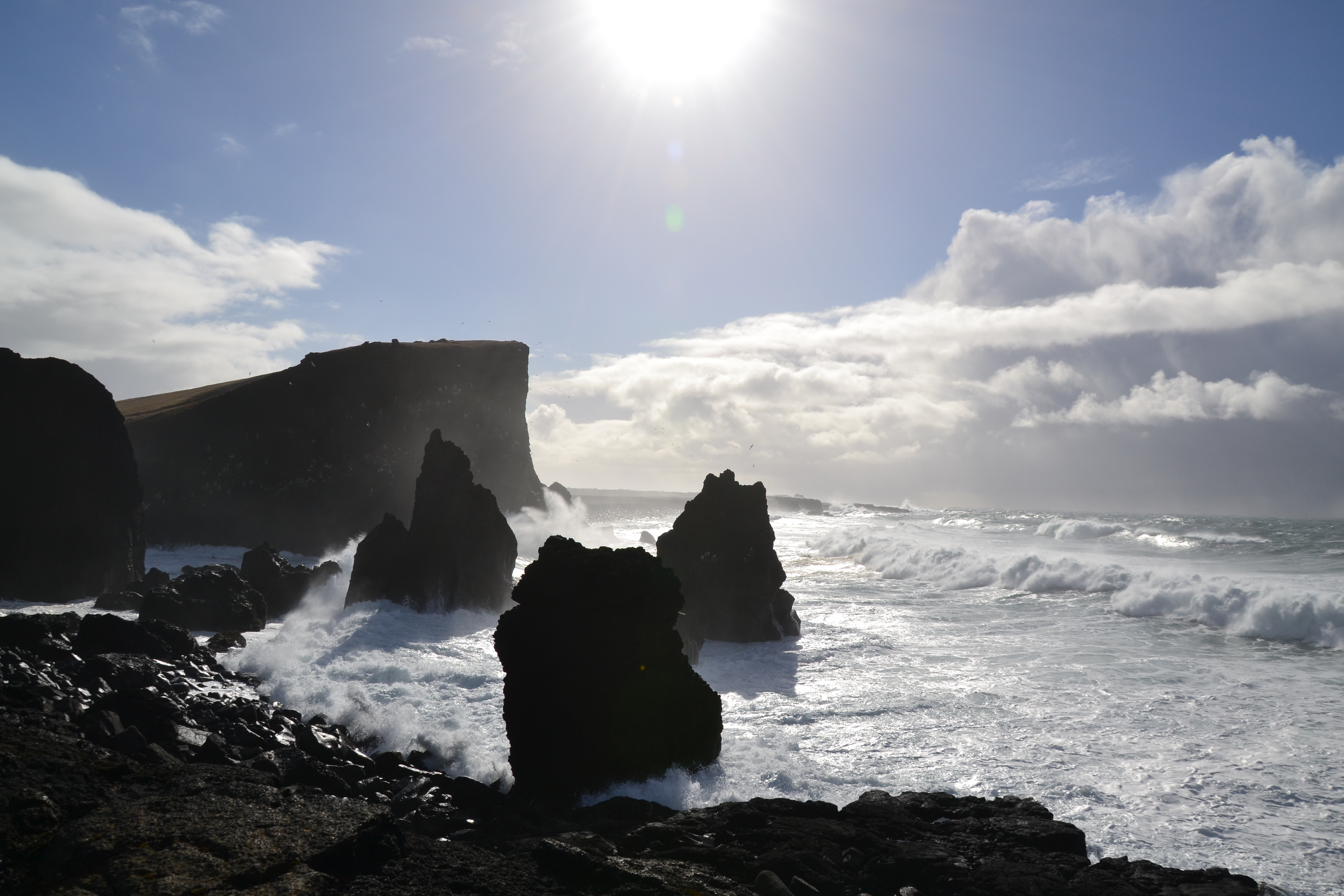 Fast in Sichtweite befindet sich Dyrhólaey, die „Türlochinsel“. Der Weg war dennoch deutlich mühsamer als zunächst vermutet. Die Straße nach oben war von riesigen Schlaglöchern und tiefen Pfützen übersät und die entgegenkommenden Fahrzeuge machten die Sache auch nicht einfacher. Mit ca. 10 km/h Durchschnittsgeschwindigkeit erreichten wir dennoch wohlbehalten (auch unser Mietwagen) den oben gelegenen Parkplatz. Hier befindet sich ein Leuchtturm und man hat einen super Überblick über die vom schwarzen Sand und Lavasteinen geprägte isländische Küste. Das beste Fotomotiv war dennoch der Torbogen: