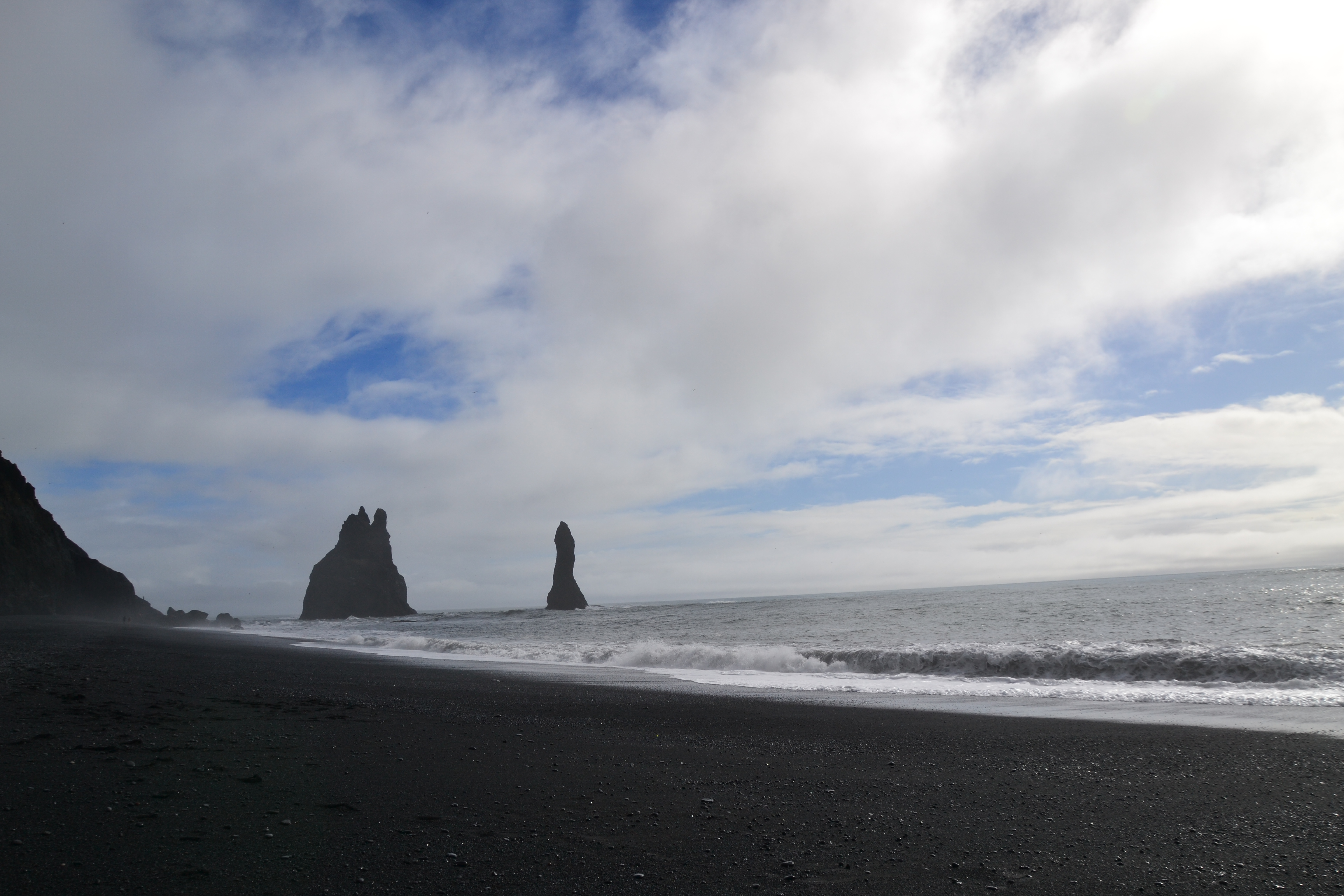 Anschließend ging es bei Wind und etwas Regen weiter nach Vík í Mýrdal, dem südlichsten Ort Islands, sofern man nur die Hauptinsel betrachtet. Hier in der Nähe gibt es gleich mehrere Besonderheiten, die allesamt direkt an der Küste liegen. Der breite Strandabschnitt Reynisfjara mit den dazugehörigen schwarzen Felsnadeln (Reynisdrangar) bieten eine sehr windige, aber auch schöne Kulisse.