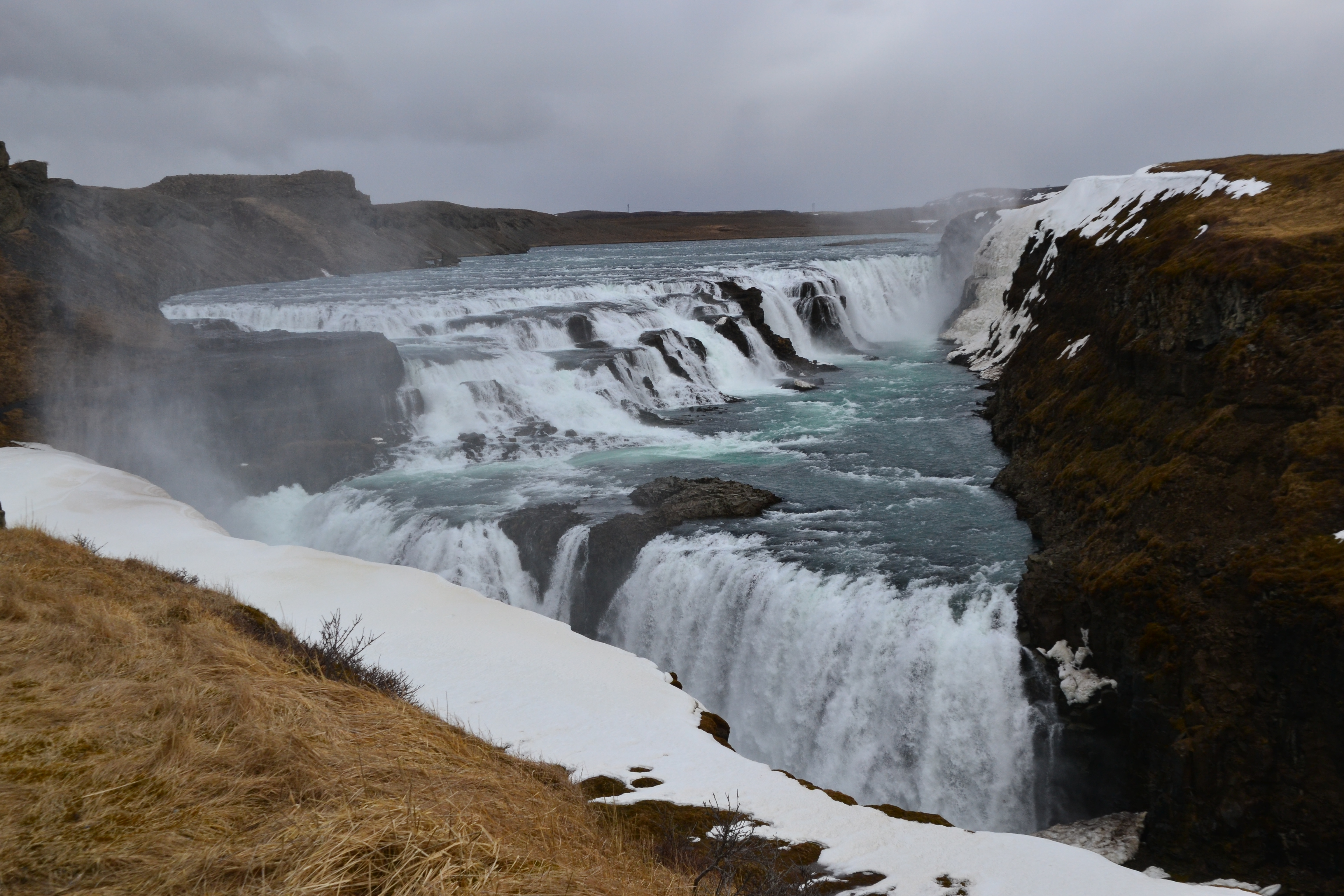 Am nächsten Tag ging es zu ein paar der bekanntesten Sehenswürdigkeiten Islands, es ging auf den „Golden Circle“. Der erste Zwischenhalt lag am Kratersee Kerið. Das nächste Ziel war die erste größer beworbene Sehenswürdigkeit, der Wasserfall Gullfoss. Dies merkte man, es standen Touribus an Touribus auf dem groß angelegten Parkplatz und es bildete sich eine Schlange auf den Treppen nach unten. Nur schwer vorstellbar, wie es hier im Sommer aussehen mag, wir waren schließlich Anfang April bei weitem nicht in der Hauptsaison dort. Schön anzuschauen ist der Wasserfall natürlich trotzdem 🙂