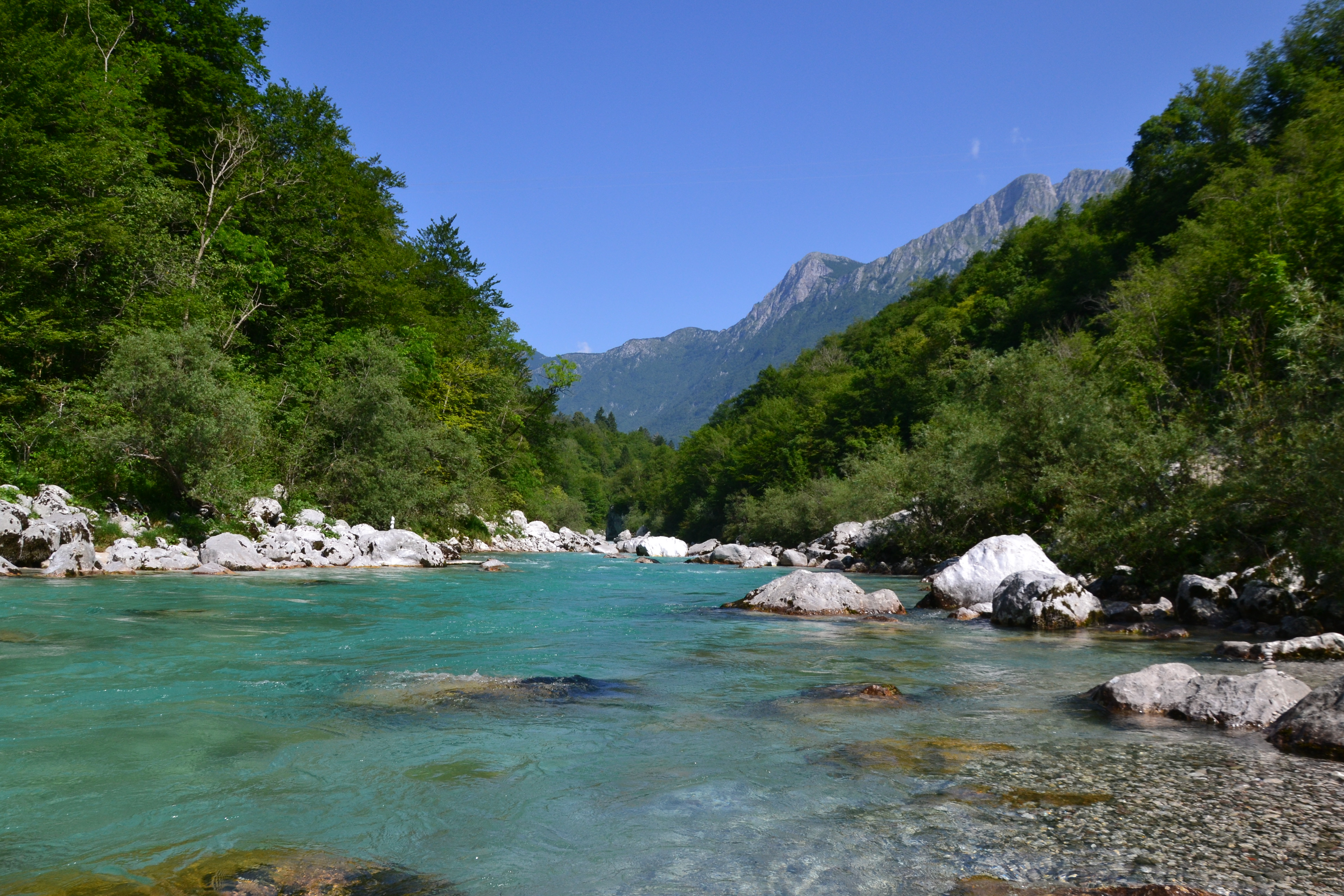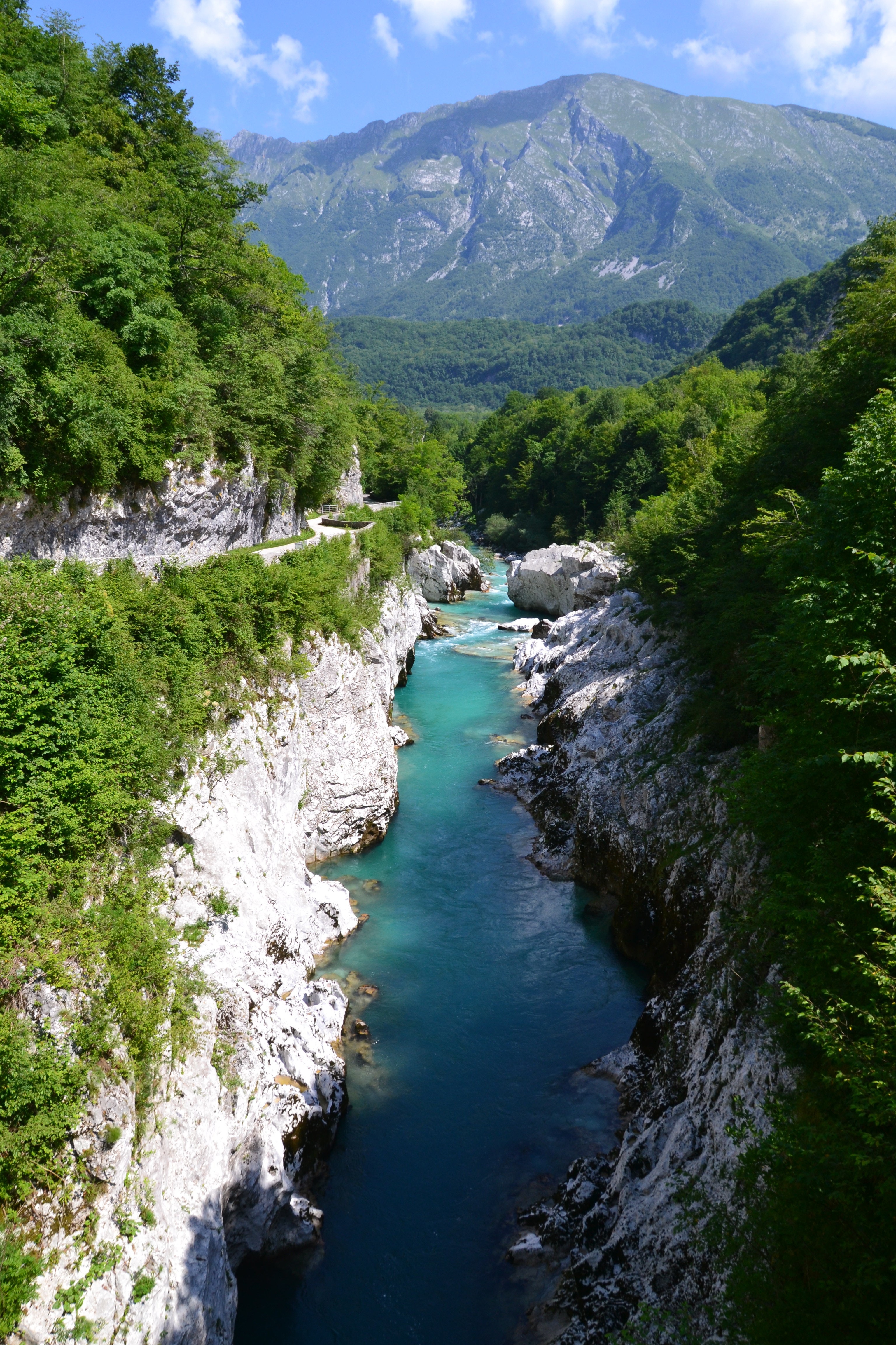 Unser erstes Ziel führte ins Soča-Tal. Bereits am frühen Morgen starteten wir mit der leichten und angenehmen Wanderung zum Slap Kozjak, einem felsendurchfließenden Wasserfall. Der Weg führte durch den Wald und am eiskalten Soča vorbei, was auf Grund der bereits am Vormittag steigenden Temperaturen (es war schließlich Sommer) sehr angenehm war. Wir waren wirklich begeistert von der Natur, zudem wir nahezu allein waren. Erst auf dem Rückweg kamen uns ein paar Leute entgegen.