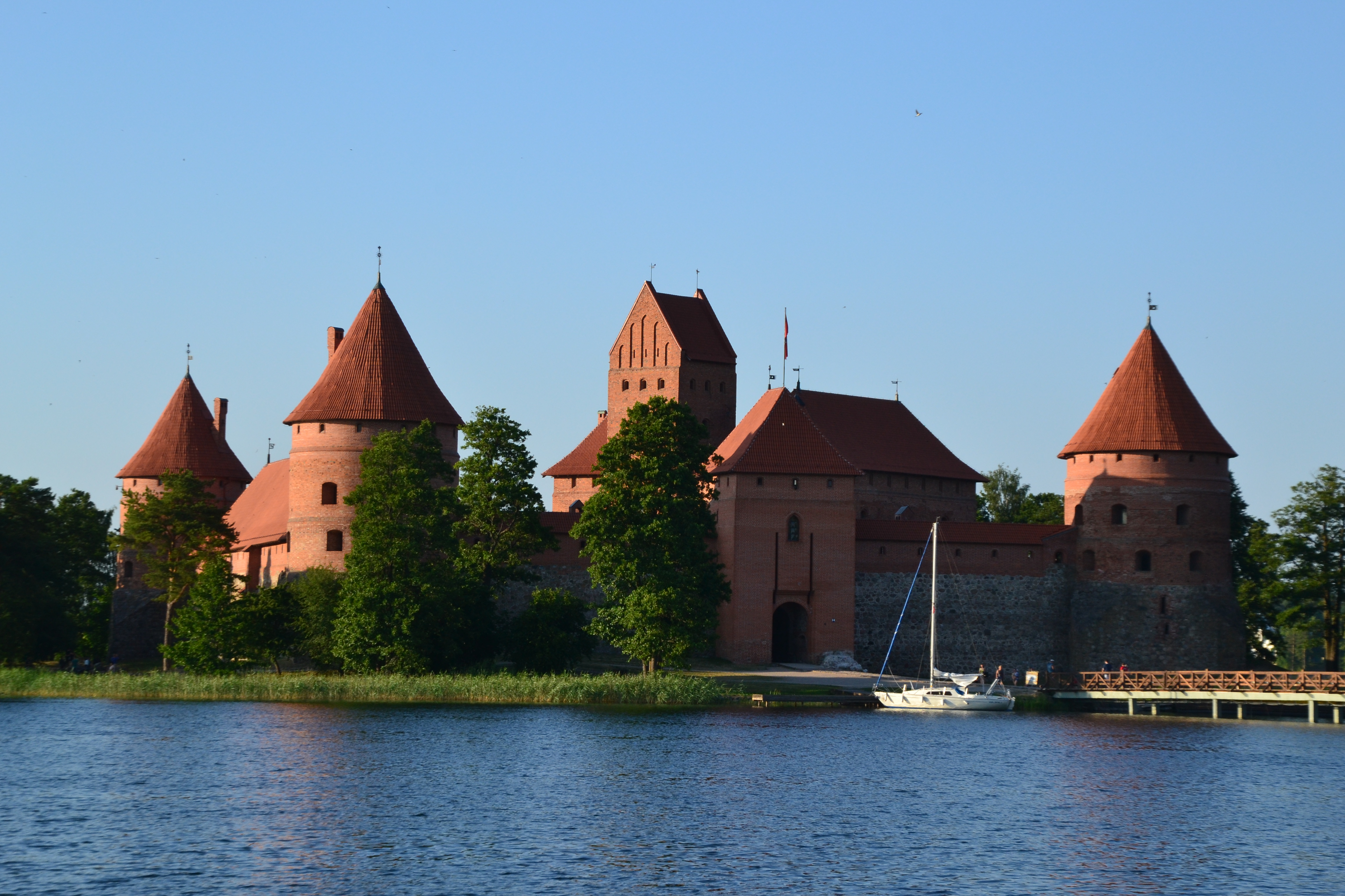 Damit lag abgesehen von der Landschaft, die wir auf der Strecke durchquerten, unser erstes Ziel in Litauen: Die Wasserburg Trakai. Diese liegt schön gelegen auf einer vorgelagerten Insel und kann entweder über zwei Brücken oder mit dem (Tret-)Boot erreicht werden. Wir entschieden uns für die erste Variante. Die Burg, welche ursprünglich bereits im 14. Jahrhundert errichtet wurde, ist ein wirklich imposantes Bauwerk und es verwundert kaum, dass dieses Reiseziel bei keiner Tour durch Litauen fehlen darf.