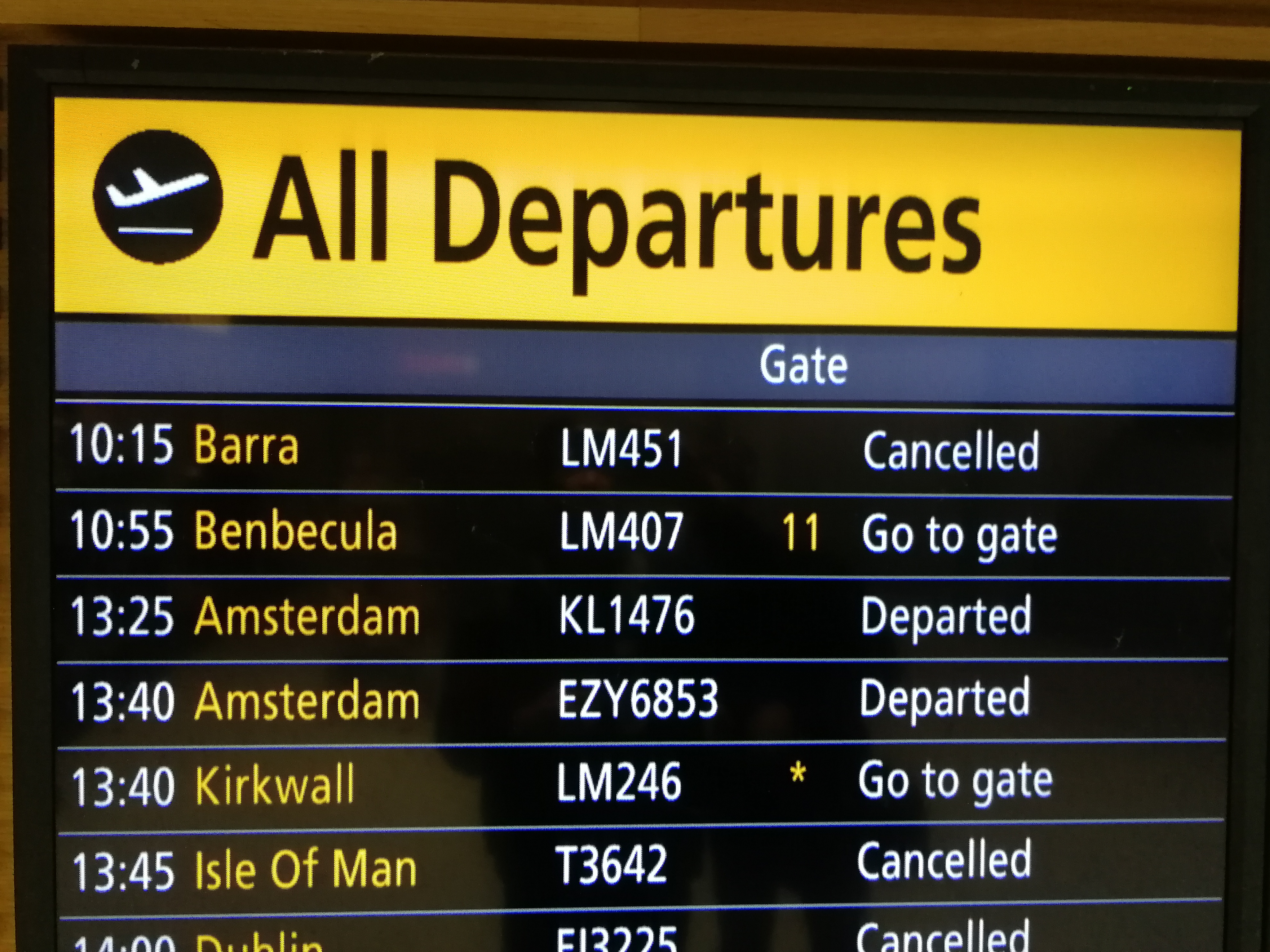 Wir hatten die zwei allerletzten Plätze auf diesem Rückflug erhalten, ich nahm in der letzten Reihe auf dem klappbaren Jumpseat platz. Wie sich am folgenden Tag herausstellte, war unsere Entscheidung goldrichtig gewesen, der Flug von Glasgow nach Barra – und damit auch der Rückflug – wurde gestrichen.