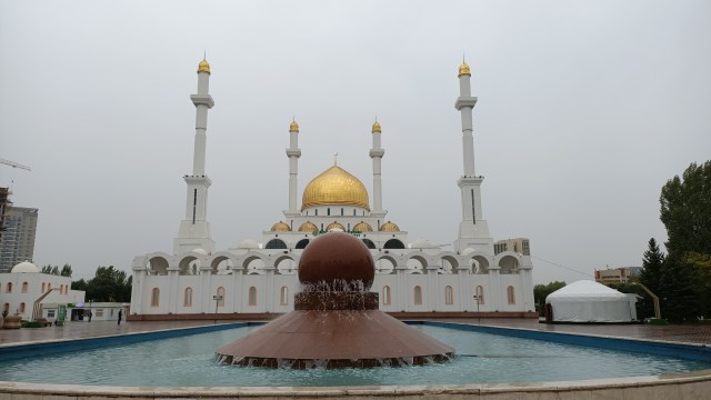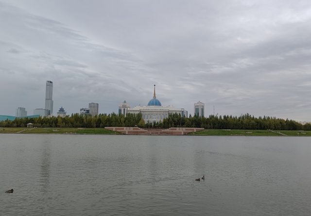 Bereits vom Bajterek-Turm aus kann man den Präsidentenpalast erkennen. Ein weißes Gebäude mit blauer Kuppel, umgeben von Grün und direkt am Wasser. Das Gelände selbst ist für die Öffentlichkeit nicht zugänglich. Den aufziehenden Regen nutzen wir nach einen Fotostopp an der Nur-Astana-Moschee für eine Stärkung in einem nahegelegenen Café.