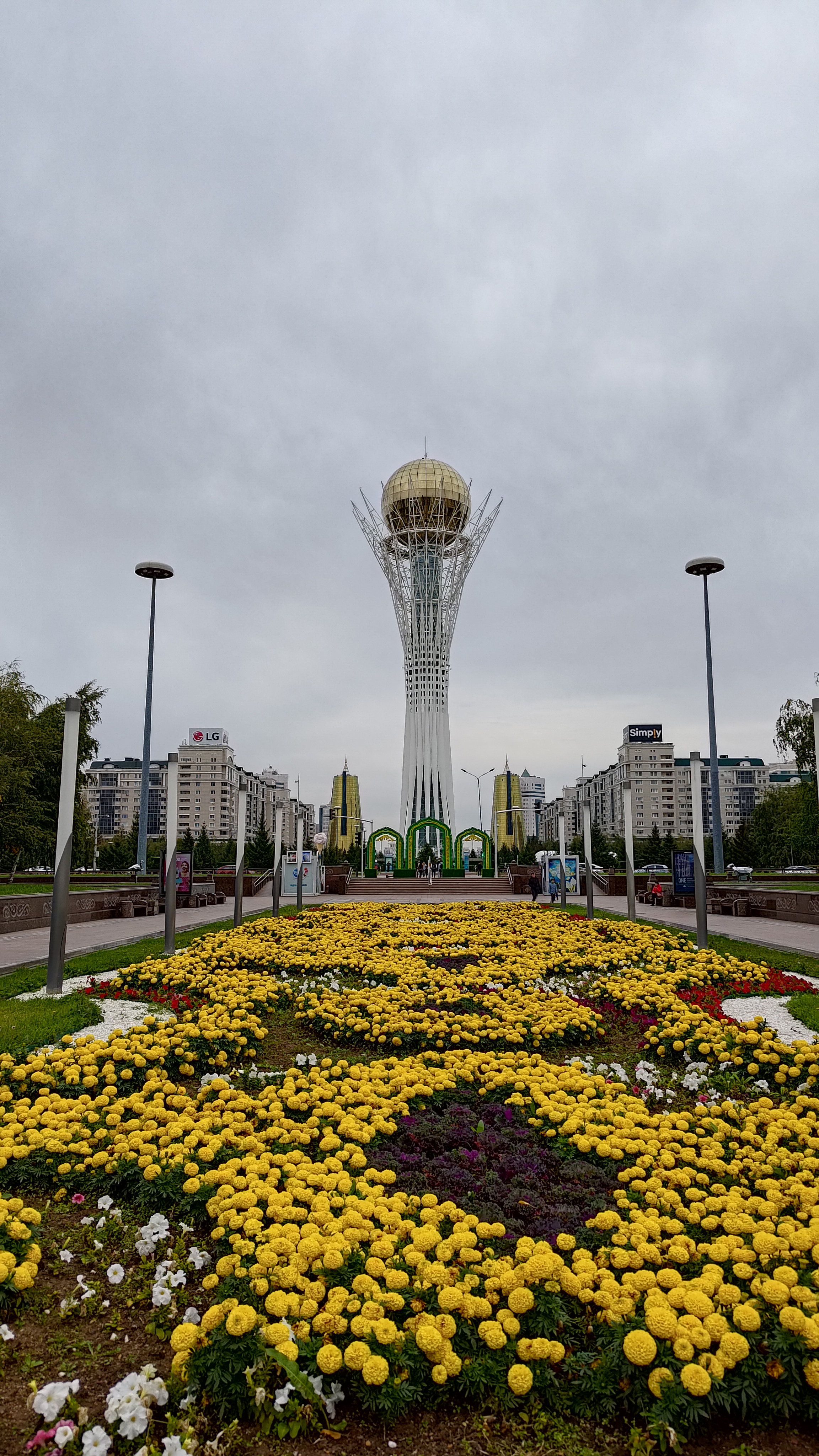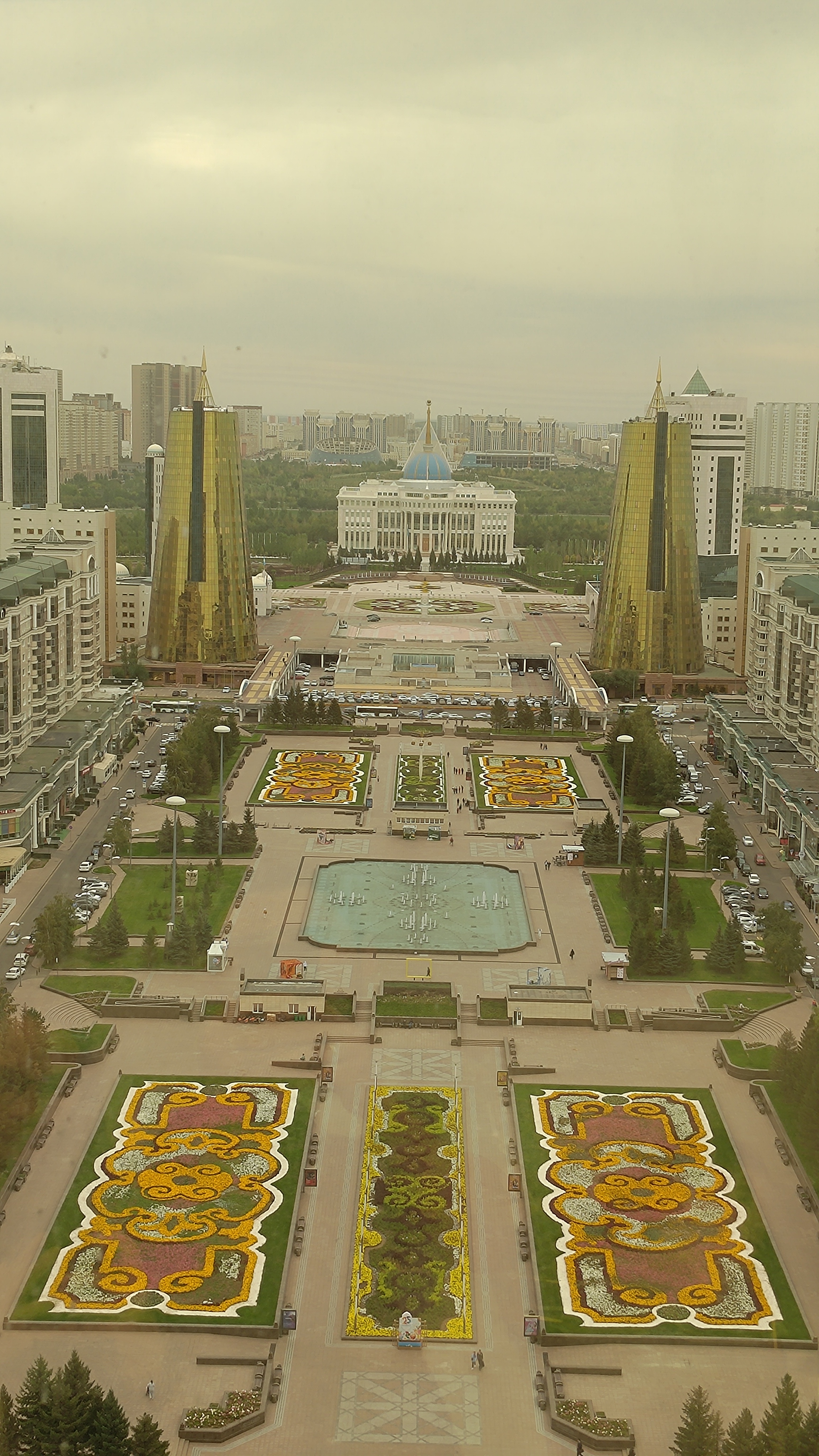 Generell sind in der Innenstadt viele Grünflächen zu finden; hier hat man mitgedacht, um keine typische Betonwüste zu schaffen. Von hier aus ging es den Nurzhol Boulevard entlang nach Osten in Richtung des Bajterek-Turms, eines der Wahrzeichen der Stadt. Auch auf diesem Weg findet man aufwändig angelegte Blumenbeete, welche den grauen Herbsttag etwas verschönerten. Auf den Turm kann man für ein paar tausend kasachische Tenge (1 € ~ 500 KZT) mit dem Aufzug hinauffahren, was wir gerne nutzen. Generell hab ich die Eintrittspreise in Kasachstan als durchaus fair empfunden. Es gibt keine „Abzocke“ durch höhere Preise für Ausländer, wie wir es anderswo leider schon häufiger erlebt hatten (am extremsten in der Türkei). Von oben aus konnte man die eingangs beschriebene Achse in beide Richtungen betrachten. Die Fotos sind durch die golden getönten Scheiben leider nicht so gut geworden, der Ausblick lohnt sich dennoch allemal. Oben gibt es zudem ein kleines Café sowie den Handabdruck des ehemaligen Präsidenten Nursultan Nasarbajew. Hier bildete sich eine Schlange Einheimischer, die Ihre Hände in den Abdruck legen wollten. Wir verzichteten darauf und bewegten uns weiter in Richtung des Präsidentenpalasts.