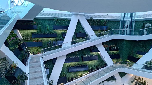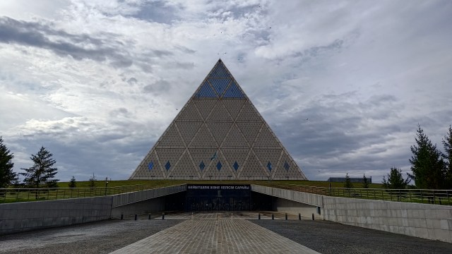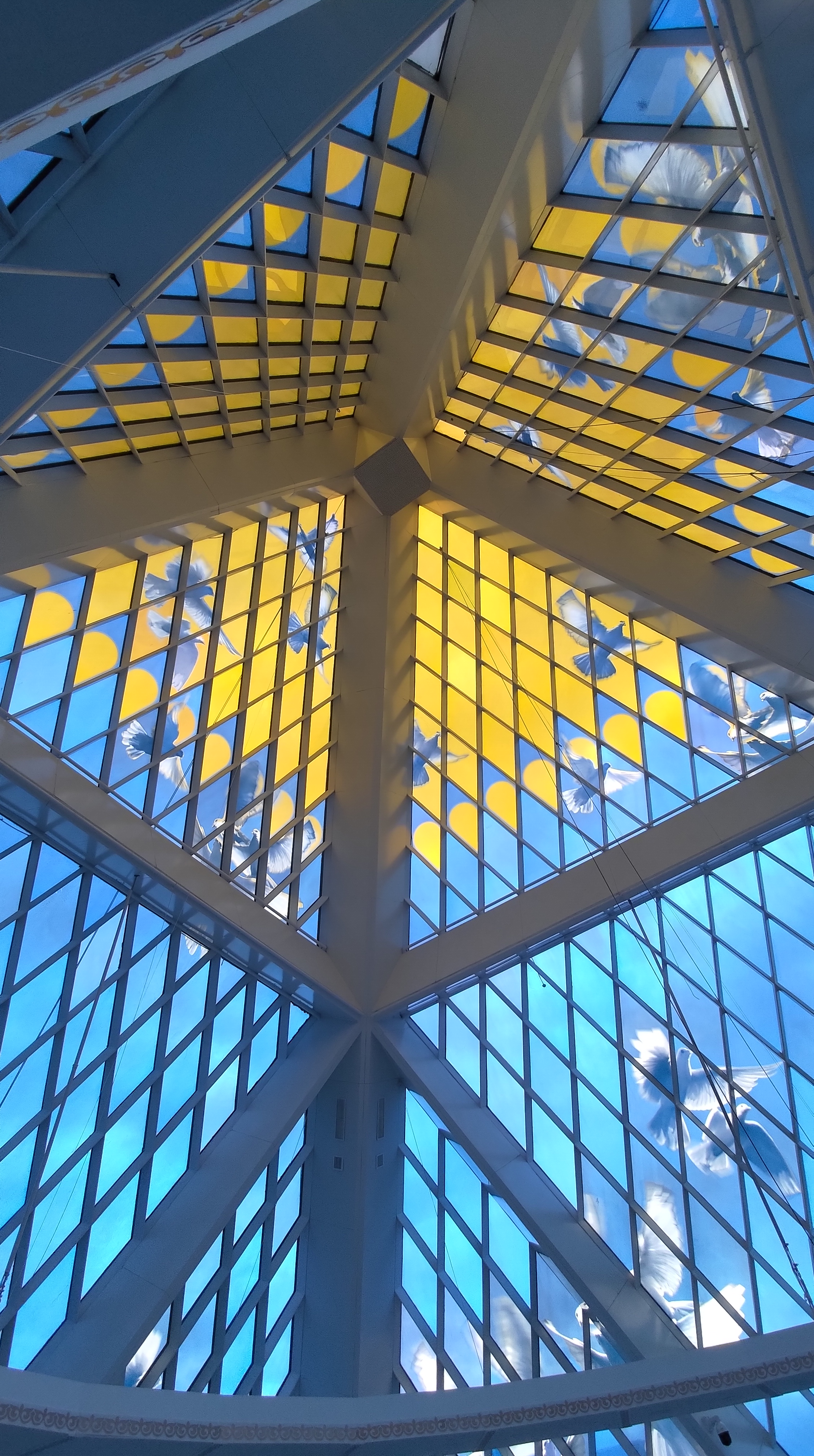 Wir hatten Glück und hatten den richtigen Zeitpunkt für unseren Besuch erwischt. Direkt nach dem Eingang wurden wir abgefangen und gefragt, ob wir nicht auch an einer englischsprachigen Tour durch das Objekt teilnehmen wollten. Das Angebot nahmen wir gerne in Anspruch und gemeinsam mit einer kleinen Gruppe konnten wir so noch ein paar zusätzliche Informationen über das Bauwerk erfahren. Im Inneren befindet sich neben einer kleinen Museumsausstellung auch ein Opernsaal, in welchem 1.500 Menschen Platz finden können. Nach einer Fahrt mit einem schräg fahrendem Aufzug geht man in Richtung der Spitze an „grünen Wänden“ entlang, auf welchen man echte und unechte Pflanzen bestaunen kann. Oben angekommen wartet an riesiger runder Tisch, den dem die alle drei Jahre stattfindenden Treffen des Congress of Leaders of World and Traditional Religions abgehalten werden. Im Rahmen dieser Veranstaltungsreihe sieht sich Kasachstan wieder als Vermittler zwischen den Regionen und Religionen der Welt. Durch die Führung erfuhren wir, dass separater Aufzug mit direktem Zugang zum Besprechungsbereich existiert, den der ehemalige kasachische Präsident gerne für seine Auftritte nutze. Durch die vielen bemalten Glasfenster wirkt der Bereich sehr hell und man fühlt sich tatsächlich dem Himmel ein bisschen näher. Architektonisch meiner Meinung nach sehr gelungen.