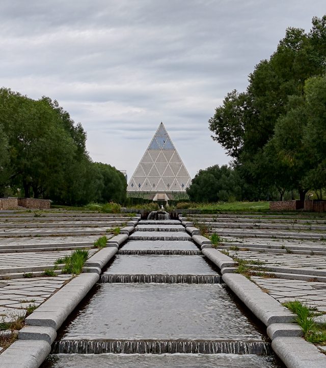 Eines der Dinge, welches uns am meisten beindruck hat, ist wie – im Gegensatz zu anderen modernen Städten – städtebaulich durchdacht die verschiedenen Bauwerke miteinander verbunden sind. So besteht eine kilometerlange Achse mehrerer wichtiger Gebäude, welche wir auch so „ablaufen“ konnten. Je nachdem, wo man startet, geht es mit dem „Khan Shatyr“ los. Dieses Gebäude ist ein riesiges „Zelt“, welches u.a. ein Shoppingcenter beinhaltet. Direkt davor liegt der „Lovers Park“ mit Wasserspielen, kleineren Statuen und viel Grün.