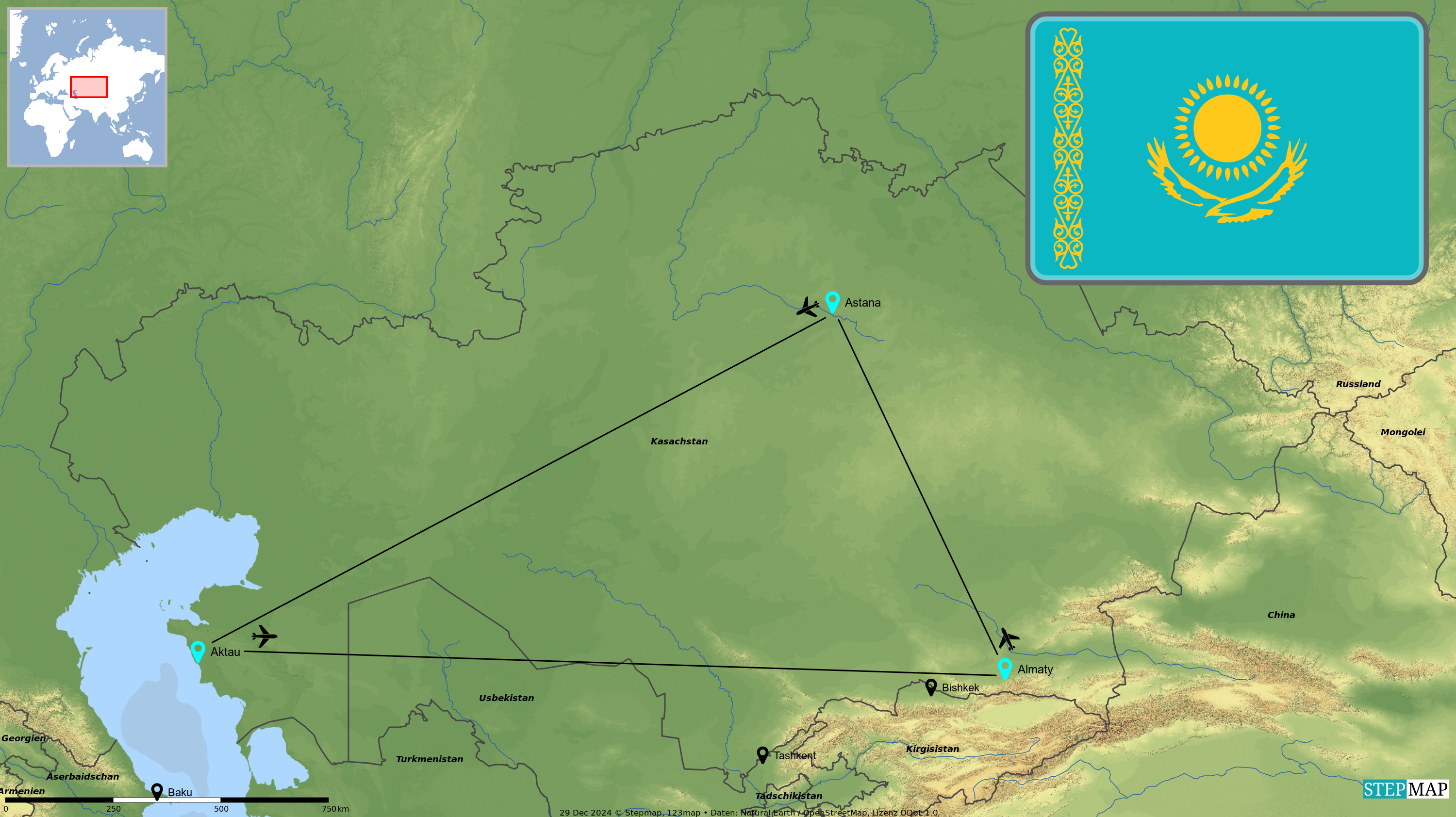 Kasachstan und auch seinen Bewohnern selbst merkt man an, dass man sehr bemüht ist, den passenden Weg zwischen „Ost“ und „West“ zu finden. Als Ex-Sowjetrepublik und mit einem nicht unerheblichen Anteil russischer Bevölkerung (und einer über 7600 km langen Grenze) ist man natürlich an guten Beziehungen zu Russland interessiert, wenngleich man spätestens seit dem russischen Angriffskrieg gegen die Ukraine einen starken Wert darauf legt, „neutral“ zu sein – anders als etwa Belarus/Weißrussland. Als größtes und auch wirtschaftlich am stärksten entwickeltes Land in der Region ist Kasachstan durchaus ein wichtiger Bezugspunkt für seine südlichen Nachbarn, insbesondere im Hinblick auf das Verhältnis zu Russland und China. Eine Bewertung der Demokratie und Freiheitsrechte nach westlichem Standard würde zwar nicht sonderlich gut ausfallen, dies gilt jedoch leider für viele (Urlaubs-)Länder weltweit. Nichtsdestotrotz kann man in Kasachstan durchaus positive Entwicklungen feststellen, wie etwa bei der Abschaffung der Todesstrafe, der Korruptionsbekämpfung, oder allgemeiner nachzulesen beim Auswärtigen Amt. Auch der Wechsel des Alphabets kann als Annäherung an den Westen gewertet werden. Als Reiseland ist Kasachstan grundsätzlich gut geeignet. Wir haben uns zu jeder Zeit sicher gefühlt und alle Menschen, die wir getroffen haben, waren – der Sprachbarriere zum Trotz – sehr freundlich und hilfsbereit. Noch ein ganz anderes Thema: Habe ich schon erwähnt, dass ich die Flagge Kasachstans für eine der schönsten der Welt halte? Mit der goldenen Sonne, dem Adler, sowie den Ornamenten auf hellblauem Grund ist die Flagge definitiv unverwechselbar und sticht aus jeder Auflistung hervor.